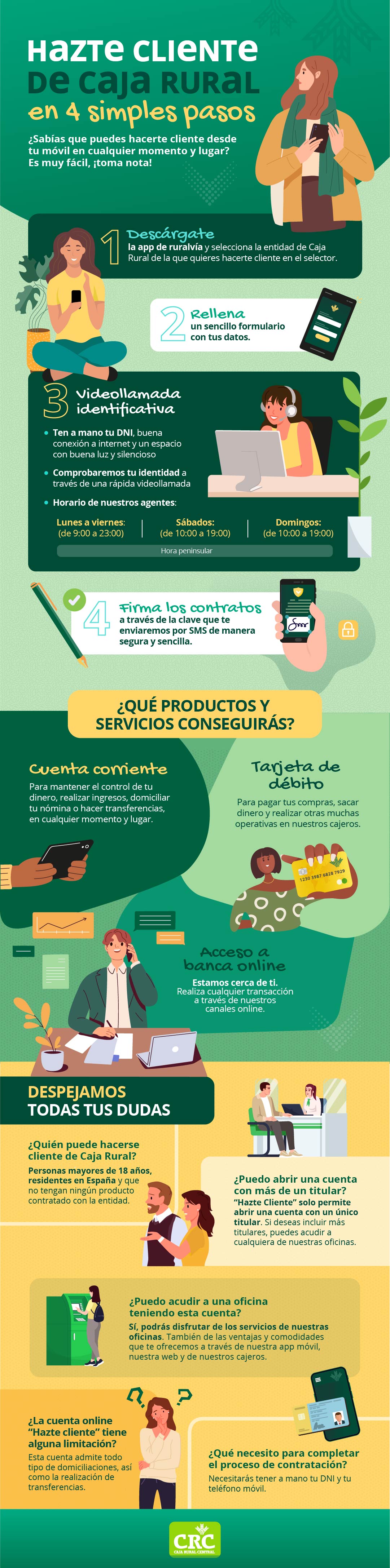 En Caja Rural Central, queremos facilitar tu día a día, por eso hemos creado esta infografía con la que podrás guiarte para convertirte en cliente de nuestra entidad de la forma más rápida y sencilla. 1. Descárgate la aplicación de Ruralvía Lo primero que debes hacer es descargar e instalar la app en tu móvil, tras este paso accede a la plataforma y escoge la opción Caja Rural Central. 2. Cumplimenta el formulario Seguidamente, tendrás que completar tus datos personales en el formulario que te proporcionamos. Ten a tu disposición el DNI durante este trámite. 3. Realiza la videollamada identificativa A continuación, mantén tu DNI cerca de ti y asegúrate de que estás en un espacio con buena conexión a internet. Es importante que este lugar esté bien iluminado y alejado de ruidos externos. Cuando estés listo/a, comprobaremos tu identidad mediante una rápida videollamada. Asimismo, recuerda que el horario para llevar a cabo este proceso durante la semana es de lunes a viernes 9:00 a 23:00 horas y los fines de semana, sábado y domingo de 10:00 a 19:00 horas. 4. Firma electrónica Por último, cuando hayamos identificado tu identidad, podrás realizar la firma online de los contratos. Para verificar este paso, te enviaremos una clave por SMS de forma rápida y segura. Y ¡listo! Ya puedes comenzar a disfrutar de los servicios de nuestra entidad. ¿Qué productos y servicios puedes conseguir por ser cliente de Caja Rural Central? Si te haces cliente de Caja Rural Central disfrutarás de diversas ventajas, entre ellas destacan:- Acceso a banca online: con esta opción podrás realizar las transacciones que quieras a través de nuestros servicios digitales.