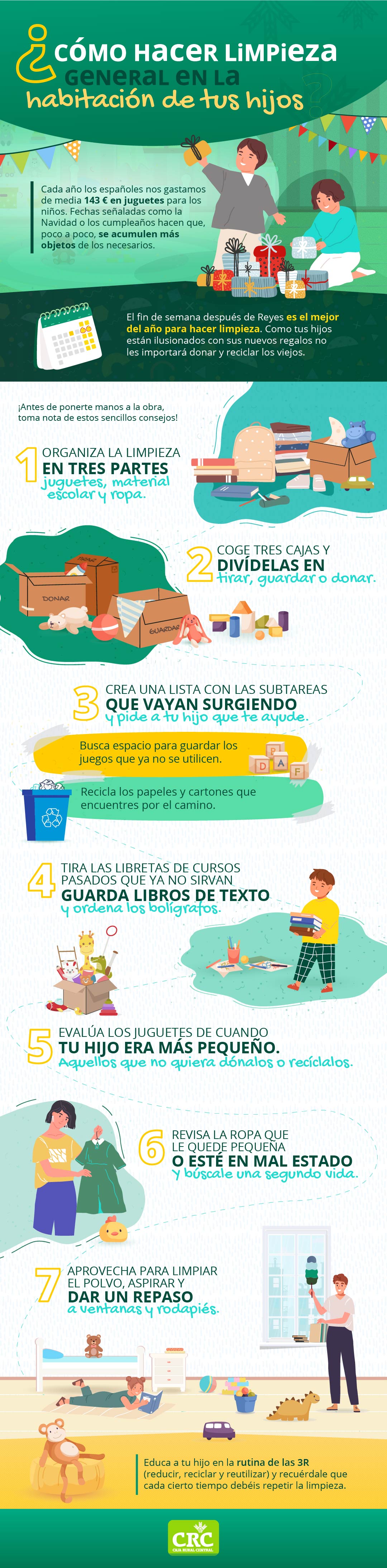 9 Consejos para limpiar hacer limpieza en la habitación de tus hijosEl cuarto de los niños puede ser un foco de juguetes y desorden. Para que esto no suceda, te damos unos consejos muy útiles. 👉 ¡Descúbrelos! Las semanas tras Navidad y Reyes son, sin duda, el mejor momento para aprovechar a hacer limpieza en las habitaciones de tus hijos. Desde luego, gracias a los nuevos regalos a tus niños les resultará más sencillo tener que renunciar a todos los que ya no utilizan. Cada año, debido a la Navidad y a los cumpleaños, los juguetes que se van acumulando en nuestros hogares van en aumento. Los españoles gastamos de media 143,91 euros al año en objetos infantiles, mientras que en Murcia, por ejemplo, esta cifra es más baja, concretamente de 91 euros. ¿Cómo puedo mantener mi casa limpia y ordenada con hijos? Si ya no te caben más juguetes en la habitación de tus hijos ha llegado el momento de hacer limpieza. Sin embargo, antes de nada, lo mejor que puedes hacer es diseñar un plan de organización. Tener presente que habrá cosas que tires a la basura, otras que vayas a donar y otras que decidas guardar en un espacio nuevo es un planteamiento que te facilitará la limpieza. En la infografía que te mostramos a continuación, encontrarás nueve consejos que te ayudarán a deshacerte de los juguetes que tus hijos no utilizan, además de organizar sus materiales escolares y su ropa. Las semanas tras Navidad y Reyes son, sin duda, el mejor momento para aprovechar a hacer limpieza en las habitaciones de tus hijos. Desde luego, gracias a los nuevos regalos a tus niños les resultará más sencillo tener que renunciar a todos los que ya no utilizan. Cada año, debido a la Navidad y a los cumpleaños, los juguetes que se van acumulando en nuestros hogares van en aumento. Los españoles gastamos de media 143,91 euros al año en objetos infantiles, mientras que en Murcia, por ejemplo, esta cifra es más baja, concretamente de 91 euros. ¿Cómo puedo mantener mi casa limpia y ordenada con hijos? Si ya no te caben más juguetes en la habitación de tus hijos ha llegado el momento de hacer limpieza. Sin embargo, antes de nada, lo mejor que puedes hacer es diseñar un plan de organización. Tener presente que habrá cosas que tires a la basura, otras que vayas a donar y otras que decidas guardar en un espacio nuevo es un planteamiento que te facilitará la limpieza. En la infografía que te mostramos a continuación, encontrarás nueve consejos que te ayudarán a deshacerte de los juguetes que tus hijos no utilizan, además de organizar sus materiales escolares y su ropa. Por último, ¡no olvides pedir a los niños que te ayuden! Esta tarea hará que se diviertan, a la par que comprenderán lo importante que es mantener su habitación limpia y debidamente ordenada.