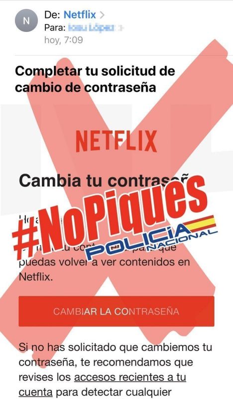La plataforma de contenido audiovisual Netflix también se ha visto involucrada en un ciberataque. Aprovechando la alta demanda que hay estos días, los delincuentes han enviado un mensaje a todas sus víctimas pidiéndoles que, por motivos de seguridad, deben cambiar la contraseña. Desde Netflix aseguran que nunca solicitan información personal por correo electrónico.