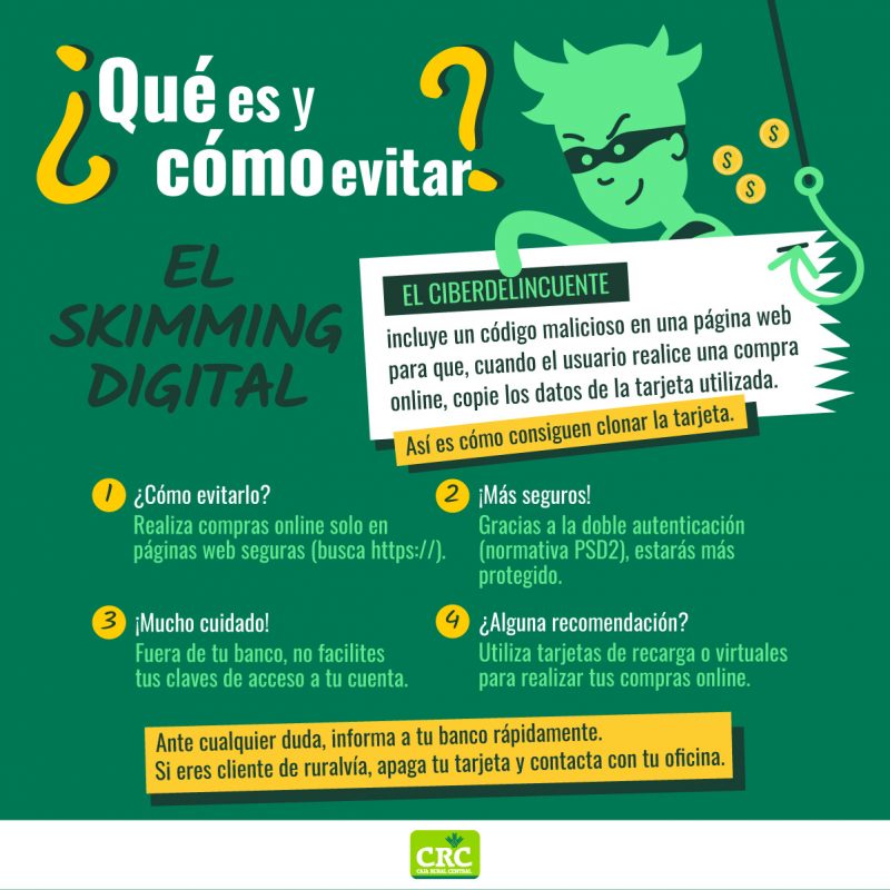 El Skimming, o la clonación digital de tus tarjetas, es un delito que sucede mientras realizas una transacción online. Para detectar este intento de robo, lo primero que debes saber es que todos podemos ser víctimas pero desde Caja Rural Central os facilitamos unas trucos para detectar el delito antes de caer en la trampa. Lo primero y más importante es ser precavido y revisar bien cualquier página web donde vas a realizar un pago. ¿Es una web segura? Si quieres contar con total seguridad, busca su dirección web cuenta con un símbolo con forma de candado. También podrás ver si la dirección web de la página empieza por https://.