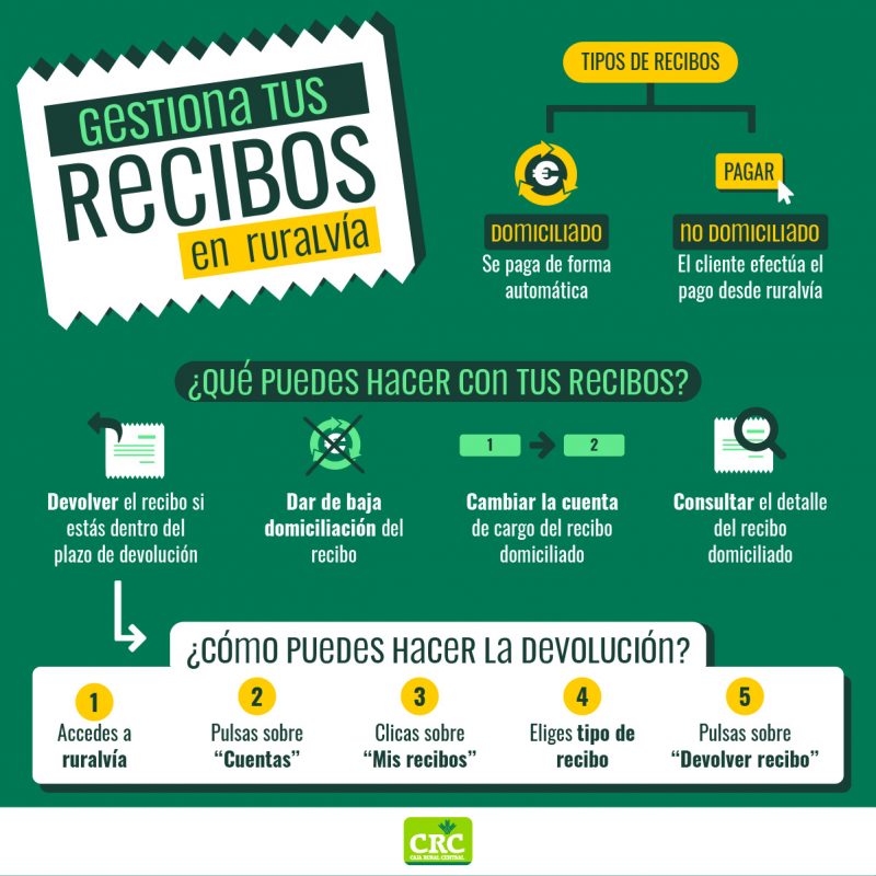 Cómo devolver un recibo desde ruralvíaAprende, paso a paso, cómo devolver un recibo de forma cómoda, fácil y rápida desde ruralvía, la banca online de Caja Rural Central. A través de ruralvía, la banca online de Caja Rural Central, nuestros clientes pueden realizar las operaciones más habituales de forma cómoda, rápida y segura. Además, ellos eligen cuándo y dónde. Una de estas operaciones es la opción de gestionar y devolver recibos. Si no sabes cómo, ¡sigue leyendo! Te lo vamos a explicar paso a paso. En primer lugar, queremos que distingas entre un recibo domiciliado y el que no lo está. Cuando hablamos de un recibo domiciliado, previamente, hemos dado una orden a nuestra entidad para que se encargue de pagarlo automáticamente. Si no está domiciliado somos nosotros quienes tenemos que ir a realizar el abono. Algo que ahorramos a nuestros clientes, ya que, a través de ruralvía, pueden pagarlos sin necesidad de ir al banco. Asimismo, tanto desde la web www.ruralvía.com, como la app, disponible para Android e iOS, pueden: A través de ruralvía, la banca online de Caja Rural Central, nuestros clientes pueden realizar las operaciones más habituales de forma cómoda, rápida y segura. Además, ellos eligen cuándo y dónde. Una de estas operaciones es la opción de gestionar y devolver recibos. Si no sabes cómo, ¡sigue leyendo! Te lo vamos a explicar paso a paso. En primer lugar, queremos que distingas entre un recibo domiciliado y el que no lo está. Cuando hablamos de un recibo domiciliado, previamente, hemos dado una orden a nuestra entidad para que se encargue de pagarlo automáticamente. Si no está domiciliado somos nosotros quienes tenemos que ir a realizar el abono. Algo que ahorramos a nuestros clientes, ya que, a través de ruralvía, pueden pagarlos sin necesidad de ir al banco. Asimismo, tanto desde la web www.ruralvía.com, como la app, disponible para Android e iOS, pueden:- Devolver recibos ya cargados siempre que estén dentro del plazo de devolución.