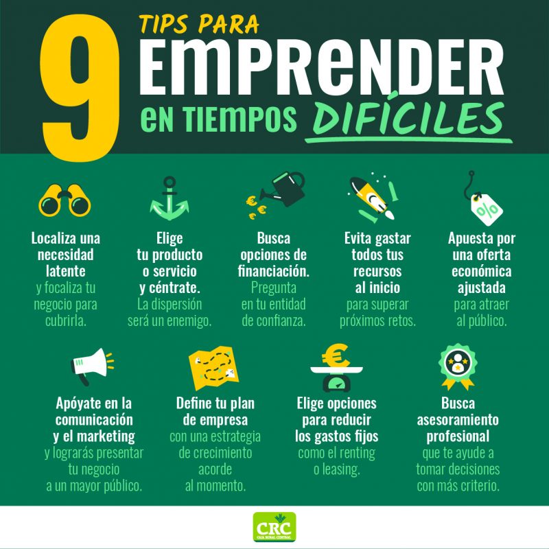 Ahora que ya sabes qué pasos deberías seguir, y que vivir una crisis económica también abre otras posibilidades de negocio, te recomendamos que te informes al máximo de todos los detalles que vas a necesitar. En Caja Rural Central, por ejemplo, ofrecemos asesoramiento financiero para facilitar a los emprendedores y empresarios de nuestra región la información más relevante para su éxito empresarial, así como las opciones de financiación disponibles para sus casos particulares.