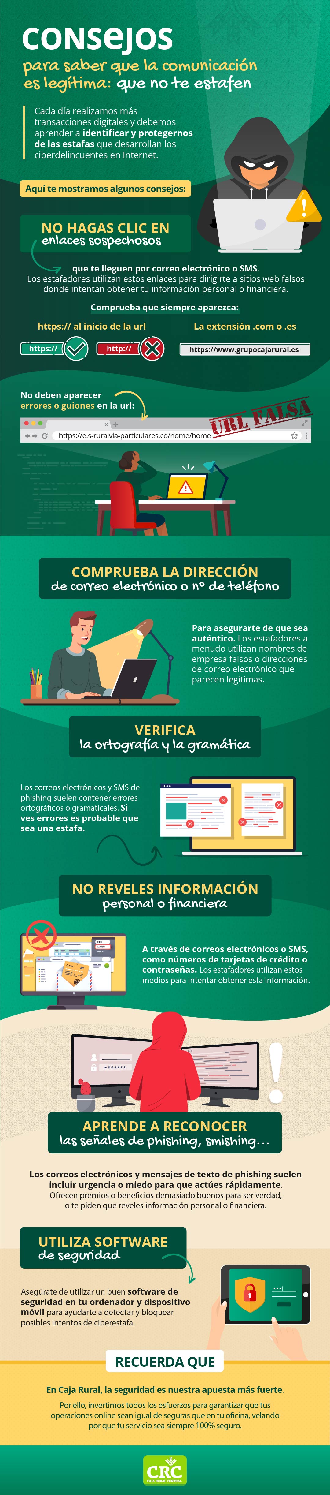 A continuación, te presentamos una infografía que te ayudará a identificar estos riesgos. En la actualidad, es posible realizar prácticamente cualquier acción mediante dispositivos electrónicos. Las transacciones en el entorno digital son fundamentales para muchas empresas y, a su vez, forman parte del día a día de la mayoría de las personas. Sin embargo, es importante ser cauteloso, ya que existe el riesgo de ser víctima de estafas digitales. A pesar de las numerosas ventajas que ofrece la tecnología, es necesario ser consciente de los riesgos que conlleva en cuanto a seguridad cibernética se refiere. ¿De qué forma puedes protegerte de las estafas digitales? A continuación, te proporcionamos las claves principales para detectar actividades sospechosas y prevenir posibles fraudes por parte de los ciberdelincuentes. La importancia de la ortografía Un indicio adicional que puede hacerte sospechar de la autenticidad de una comunicación son los errores de ortografía o gramática, los cuales son comunes en correos electrónicos fraudulentos o mensajes de texto de phishing. Evita dar datos sensibles Es importante no divulgar información personal o financiera a través de mensajes de texto o correos electrónicos. Si una entidad legítima requiere dicha información, nunca la solicitará por esos medios, sino por sus canales oficiales de comunicación. Detecta las señales de phishing Las actividades fraudulentas como el phishing o el smishing siguen ciertos patrones que nos ayudan a detectarlas. Por ejemplo, la urgencia para que se realice una acción es una señal clara de que se trata de una estafa. Además, si se recibe una comunicación en la que se supone que se ha ganado un premio importante es necesario ser cauteloso y desconfiar. Aumenta tu seguridad Es esencial tener un software de seguridad confiable en todos los dispositivos que se utilizan con frecuencia, ya sea en la computadora, teléfono móvil u otro dispositivo. De esta manera, el software mismo puede bloquear intentos de fraude con mayor eficacia. No olvides mantener el software siempre actualizado, ya que esto dificultará aún más el trabajo de los ciberdelincuentes. Evita hacer clic en enlaces sospechosos En el caso de que recibir un email o un SMS que te anime a hacer clic en un enlace, ten cuidado. Las URLs pueden ser falsas, para asegurarte de que no lo son, revisa que aparezca “https://” al comienzo de la URL, lo que indica que se trata de un sitio web seguro. Asimismo, el dominio generalmente será “.com” o “.es” y no debe haber guiones ni errores en la dirección. Un ejemplo claro de URL falsa sería la siguiente: https://e.s-ruralvia-particulares.co/home/home Verifica siempre la dirección de email o el número de teléfono Por lo general, los ciberdelincuentes suelen utilizar números de teléfonos móviles que parecen normales y direcciones de emails que parecen auténticas. No obstante, es recomendable comprobarlos antes de responder. En el caso de que se tenga duda de la procedencia, lo mejor será no contestar. En Caja Rural Central, la seguridad de nuestros clientes es una de nuestras principales prioridades. Por ello, trabajamos constantemente para asegurar que las transacciones realizadas mediante nuestra aplicación Ruralvía son totalmente seguras y aporten la mayor confianza posible.