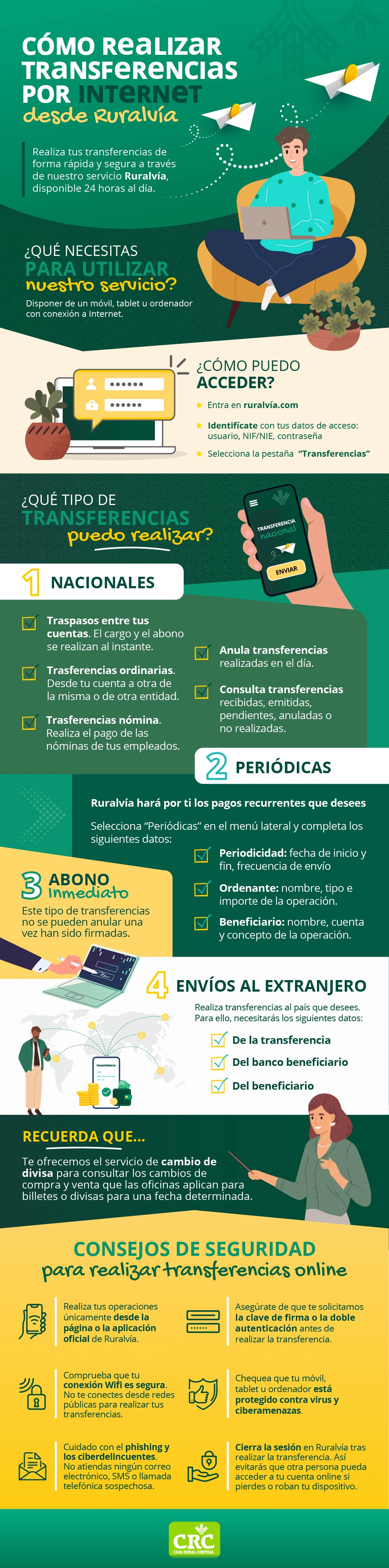 ¿Quieres saber más información sobre Ruralvía? En esta práctica infografía te detallamos todo lo que debes saber para qué puedas realizar transacciones desde Ruralvía sin ningún tipo de problema. Además, si tienes dudas sobre algunos de nuestros productos o servicios, puedes acudir a nuestras oficinas de Caja Rural Central o a través de nuestro servicio de atención digital al cliente. ¡Te estamos esperando!