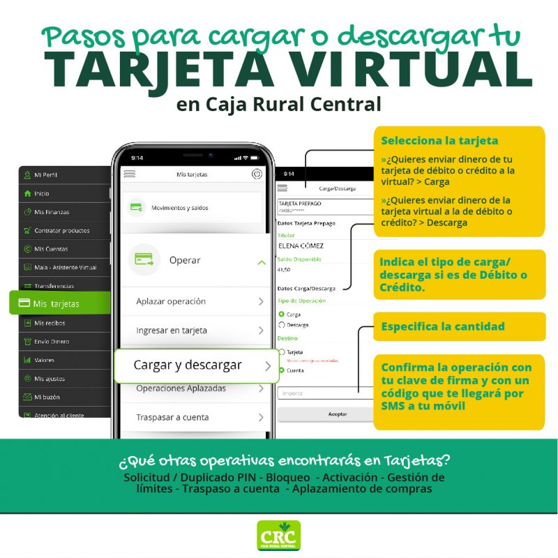 Con tu tarjeta virtual de ruralvía, no te preocupes por gastos de más. Así puedes operar con ellaLa tarjeta virtual es una gran amiga de los españoles, porque les ayuda a hacer sus compras online sin gastos innecesarios. Aprovecha sus ventajas y descubre cómo cargarla y descargarla desde la banca móvil de ruralvía. La tarjeta virtual es un socio increíble para realizar los pagos online de forma cómoda, rápida y segura. Es tan fácil como cargar la cantidad que necesitas para tus productos, entrar en el carrito de la compra y elegir tu forma de pago para llevarte lo que quieres sin pagar un solo céntimo de más. Es un monedero digital muy útil, también, para planificar tus objetivos de ahorro sin preocuparte de los gastos hormiga. Con la tarjeta virtual no tienes que agobiarte por los gastos innecesarios y tendrás una herramienta muy poderosa para que la planificación de tus presupuestos mensuales vaya como la seda. Esta infografía te enseña todo lo que necesitas saber para cargar y descargar tu tarjeta virtual de Caja Rural Central, así como el proceso que debes seguir en ruralvía, tu banca móvil, para tenerla lista en cualquier situación. Las tarjetas de Caja Rural Central no solo te ayudan en tus compras en línea dentro de tus comercios electrónicos, sino que sirven para muchas otras circunstancias ya sea en casa, en tu empresa o en cualquier lugar. Estos son algunos ejemplos de las tarjetas que tienes a tu disposición: La tarjeta virtual es un socio increíble para realizar los pagos online de forma cómoda, rápida y segura. Es tan fácil como cargar la cantidad que necesitas para tus productos, entrar en el carrito de la compra y elegir tu forma de pago para llevarte lo que quieres sin pagar un solo céntimo de más. Es un monedero digital muy útil, también, para planificar tus objetivos de ahorro sin preocuparte de los gastos hormiga. Con la tarjeta virtual no tienes que agobiarte por los gastos innecesarios y tendrás una herramienta muy poderosa para que la planificación de tus presupuestos mensuales vaya como la seda. Esta infografía te enseña todo lo que necesitas saber para cargar y descargar tu tarjeta virtual de Caja Rural Central, así como el proceso que debes seguir en ruralvía, tu banca móvil, para tenerla lista en cualquier situación. Las tarjetas de Caja Rural Central no solo te ayudan en tus compras en línea dentro de tus comercios electrónicos, sino que sirven para muchas otras circunstancias ya sea en casa, en tu empresa o en cualquier lugar. Estos son algunos ejemplos de las tarjetas que tienes a tu disposición:- Tarjeta Visa Débito para tus cuentas.