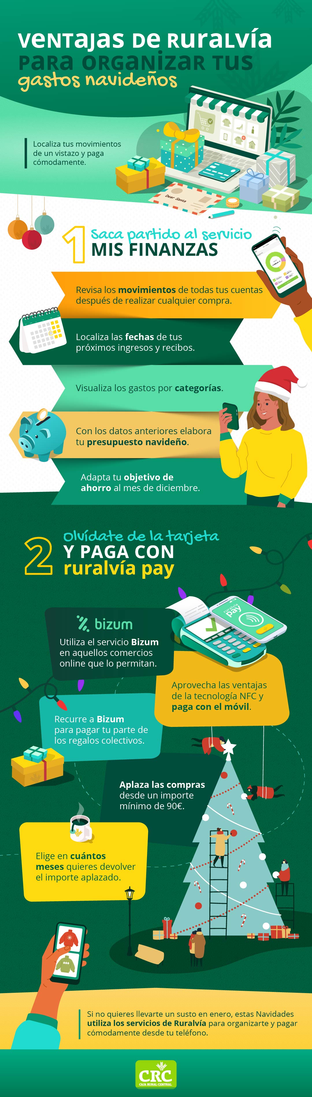 ¿Conoces las ventajas de Ruralvía para organizar tus gastos navideños?Si quieres gestionar los gastos de diciembre con cabeza, te recomendamos estas herramientas y servicios disponibles para clientes de CRC Llega la Navidad y nos enfrentamos al mismo dilema de todos los años: ante la tentación de comprarnos caprichos, nos recordamos que quizá estemos excediéndonos en el gasto festivo. En estas fechas se nos acumulan los eventos sociales, de modo que cada cena o celebración se lleva un pellizco de nuestro presupuesto navideño. Si a esto le sumamos los regalos, el total puede ascender a una cifra peliaguda y la cuesta de enero nos espera al final del camino. Si quieres gestionar los gastos de diciembre con cabeza, te recomendamos estas herramientas y servicios disponibles para cualquier cliente de Caja Rural Central: Llega la Navidad y nos enfrentamos al mismo dilema de todos los años: ante la tentación de comprarnos caprichos, nos recordamos que quizá estemos excediéndonos en el gasto festivo. En estas fechas se nos acumulan los eventos sociales, de modo que cada cena o celebración se lleva un pellizco de nuestro presupuesto navideño. Si a esto le sumamos los regalos, el total puede ascender a una cifra peliaguda y la cuesta de enero nos espera al final del camino. Si quieres gestionar los gastos de diciembre con cabeza, te recomendamos estas herramientas y servicios disponibles para cualquier cliente de Caja Rural Central:- Utiliza los servicios de pago móvil que tienes disponible con las tarjetas de CRC. Podrás pagar con Apple Pay, Google Pay, Samsung Pay o con Ruralvía Pay. ¡Tú decides cuál te gusta más!