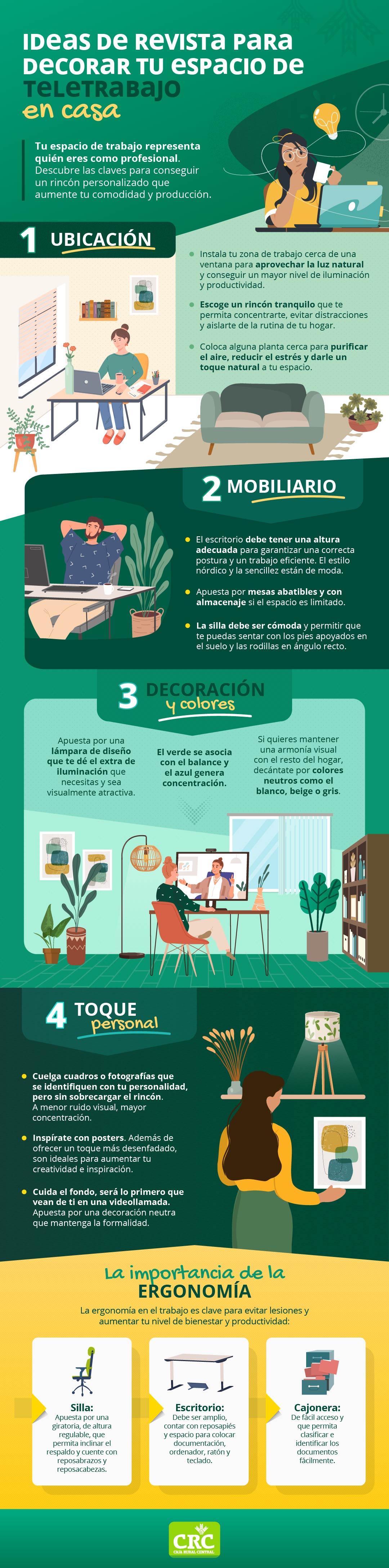 Decora con estilo tu espacio de trabajo¿Quieres dar un cambio a tu espacio de teletrabajo? En este post te contamos algunos consejos de decoración que pueden ayudarte a aumentar tu rendimiento profesional. La crisis sanitaria que hemos vivido estos últimos años ha generado cambios apreciables en el ámbito laboral, uno de ellos ha sido el impulso del teletrabajo. Esta nueva forma de trabajo, forzada por el confinamiento, ha causado que ocupemos espacios de nuestro hogar para realizar actividades laborales, a veces poco adecuados por el déficit de confort o la excesiva decoración que distrae nuestra atención. Escoger un lugar improvisado para convertirlo en tu nuevo espacio laboral puede ser complicado. Por esto mismo, es importante encontrar soluciones para crear un espacio cómodo con una decoración equilibrada que ayude a fomentar nuestra productividad. ¿Dónde debes ubicar este espacio? El espacio de teletrabajo influye notablemente en nuestro rendimiento. Existen muchos aspectos relevantes que se deben tener en cuenta, como la iluminación y la tranquilidad del lugar. Lo más aconsejable es que el rincón laboral elegido esté cerca de una ventana para que puedas disfrutar de las ventajas de la luz natural. Otro de los aspectos indispensables es que este lugar sea tranquilo, sin ruidos externos, que te permita estar concentrado al cien por cien para realizar con éxito tus tareas. Si buscas darle un toque natural al ambiente, siempre puedes colocar una planta cerca de tu escritorio, esto ayudará a purificar el aire y mejorará el bienestar. Elige los muebles más adecuados Pasamos mucho tiempo en nuestra área de trabajo, por lo que es imprescindible optar por un mobiliario adecuado a nuestras necesidades. Por esto mismo, es necesario contar con un escritorio que tenga una altura apropiada para mantener una postura correcta ante el ordenador. Una solución ideal para aprovechar espacios pequeños o limitados son las mesas abatibles. A la hora de escoger la silla, debe presentar un confort adecuado para tu espalda, que te permita posicionar las rodillas en ángulo recto y apoyar los pies en el suelo. ¿Por qué es importante la decoración? El entorno que nos rodea y, en especial, la decoración son cuestiones relevantes para rendir de forma eficiente en nuestro trabajo. Por la tanto, hay que intentar mantener un equilibrio visual en la decoración de nuestro hogar. En este caso, los colores que mejor casan con cualquier mobiliario y nos ayudan a crear un ambiente calmado y reflexivo son el blanco, el gris o el beige. Además, otra gama de colores que propicia la concentración y el equilibrio son el azul o el verde. Si queremos darle un toque de estilo a este espacio siempre se puede combinar con una lámpara de diseño que aporte esa iluminación que tanto necesitamos en los días más nublados. Personaliza tu rincón En este sentido, todo dependerá de nuestros gustos y de cómo queremos impregnar nuestra esencia en este rincón laboral. Las opciones son varias: desde colgar cuadros o fotografías para equilibrar nuestra armonía visual hasta pósters, para darle un toque original y desenfadado a este espacio. Eso sí, debemos prestar atención al fondo donde se van a realizar las videollamadas para causar una buena impresión a nuestros clientes, compañeros y jefes. Para ello, es mejor decidirse por una decoración neutra que trasmita sensación de profesionalidad. Dale importancia a la ergonomía La ergonomía es la disciplina que adapta el trabajo a la necesidad del trabajador con el fin de cuidar su salud y bienestar laboral. ¿Cómo se puede mejorar las condiciones de tu trabajo? Las sillas giratorias y regulables, las mesas con reposapiés y los muebles de almacenamiento de fácil acceso son algunas soluciones efectivas que ayudan a reducir las lesiones físicas de algunos trabajadores. La crisis sanitaria que hemos vivido estos últimos años ha generado cambios apreciables en el ámbito laboral, uno de ellos ha sido el impulso del teletrabajo. Esta nueva forma de trabajo, forzada por el confinamiento, ha causado que ocupemos espacios de nuestro hogar para realizar actividades laborales, a veces poco adecuados por el déficit de confort o la excesiva decoración que distrae nuestra atención. Escoger un lugar improvisado para convertirlo en tu nuevo espacio laboral puede ser complicado. Por esto mismo, es importante encontrar soluciones para crear un espacio cómodo con una decoración equilibrada que ayude a fomentar nuestra productividad. ¿Dónde debes ubicar este espacio? El espacio de teletrabajo influye notablemente en nuestro rendimiento. Existen muchos aspectos relevantes que se deben tener en cuenta, como la iluminación y la tranquilidad del lugar. Lo más aconsejable es que el rincón laboral elegido esté cerca de una ventana para que puedas disfrutar de las ventajas de la luz natural. Otro de los aspectos indispensables es que este lugar sea tranquilo, sin ruidos externos, que te permita estar concentrado al cien por cien para realizar con éxito tus tareas. Si buscas darle un toque natural al ambiente, siempre puedes colocar una planta cerca de tu escritorio, esto ayudará a purificar el aire y mejorará el bienestar. Elige los muebles más adecuados Pasamos mucho tiempo en nuestra área de trabajo, por lo que es imprescindible optar por un mobiliario adecuado a nuestras necesidades. Por esto mismo, es necesario contar con un escritorio que tenga una altura apropiada para mantener una postura correcta ante el ordenador. Una solución ideal para aprovechar espacios pequeños o limitados son las mesas abatibles. A la hora de escoger la silla, debe presentar un confort adecuado para tu espalda, que te permita posicionar las rodillas en ángulo recto y apoyar los pies en el suelo. ¿Por qué es importante la decoración? El entorno que nos rodea y, en especial, la decoración son cuestiones relevantes para rendir de forma eficiente en nuestro trabajo. Po