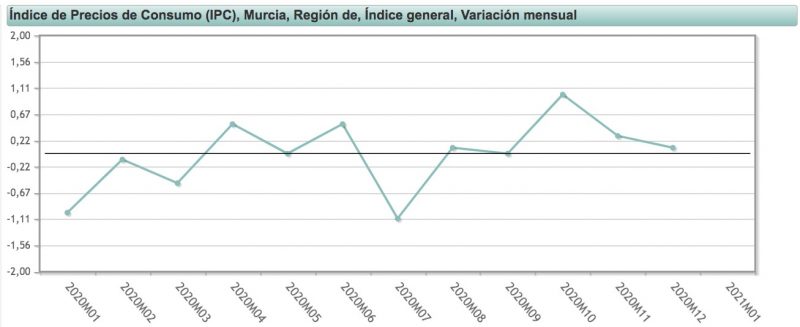 Variación mensual del IPC en la Región de Murcia. Enero 2020-2021. Fuente: INE