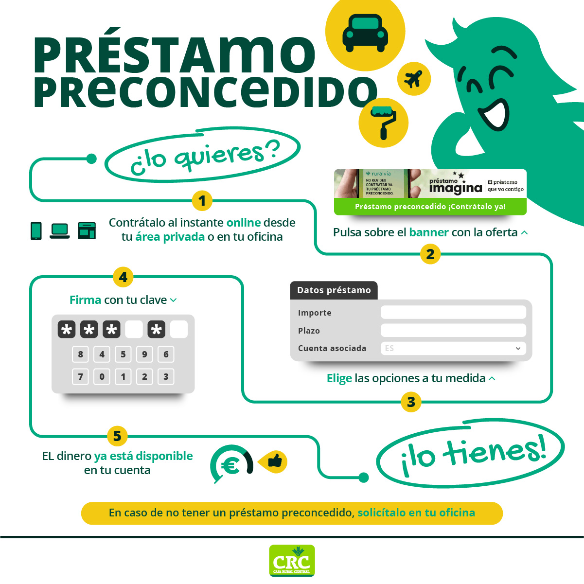 Una gran ventaja de tener algún tipo de relación con una entidad bancaria es el hecho de poder solicitar y recibir dinero para financiar alguna de tus necesidades. Este es el fin de los llamados préstamos preconcedidos que algunos bancos ofertan a ciertos clientes tras un estudio preliminar. ¿En qué consiste un préstamo preconcedido? El préstamo preconcedido es un producto financiero exclusivo de clientes que brinda la contratación automática y que tiene en consideración la situación financiera propia del cliente en cuestión. Esto significa que Caja Rural Central, como entidad financiera, considera que aquel cliente al que se le oferte este tipo de préstamo cumple las condiciones para que le sea concedido. Esto se debe a que el banco ya dispone de la información previa necesaria para que así sea, por lo que el trámite es inmediato. Los clientes de Caja Rural Central pueden contratarlo a través de la banca digital, Ruralvía, sin esperas y sin necesidad de acudir presencialmente a una sucursal.