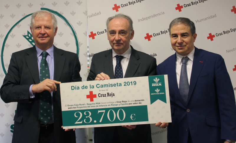 Un año más, el grupo Caja Rural ha demostrado que el compromiso con las personas más desfavorecidas es uno de los pilares fundamentales de su actividad. Por ello, el Grupo Caja Rural volvió a celebrar su tradicional Día de la Camiseta en el que los más de 8.000 empleados y empleadas del Grupo Caja Rural se vistieron de verde para dar visibilidad a la labor solidaria del grupo. En esta ocasión, el Día de la Camiseta tuvo lugar el 5 de septiembre y contó con un marcado carácter solidario: el 10% de las pólizas de Seguros RGA vendidas ese día se destinarán a diferentes proyectos de Cruz Roja Española dirigidos a apoyar a la infancia en riesgo social y a las familias en su función educadora. La donación, que ha alcanzado los 23.700€, se ha formalizado en la sede central de Cruz Roja en presencia de Raúl Sánchez Lorenzo, secretario general de la Asociación Española de Cajas Rurales; Pablo González de Castejón, director general de Seguros RGA y Leopoldo Pérez Suárez, secretario general de Cruz Roja.