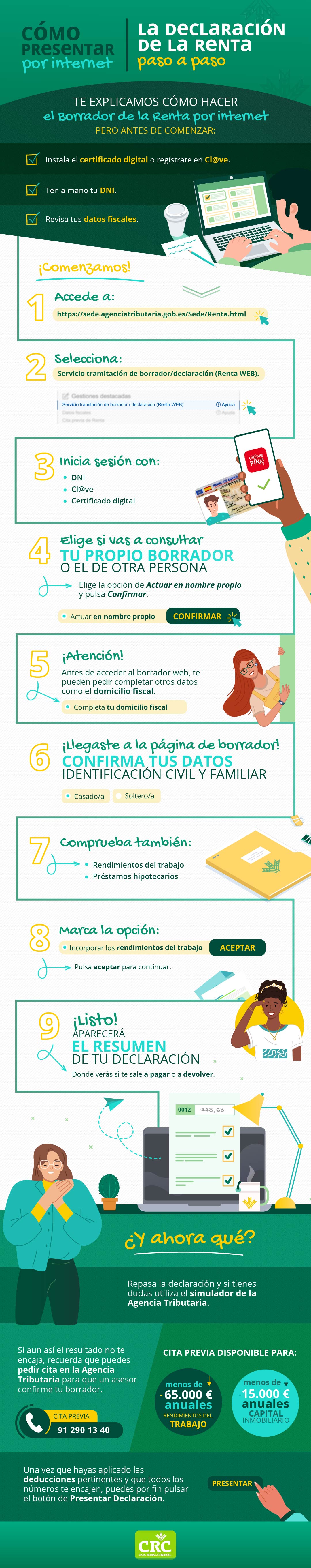 La Agencia Tributaria tiene un largo recorrido en términos de digitalización, pues hace varios años que habilitó la opción de presentar la declaración de la renta online. Con el estallido de la pandemia, muchos contribuyentes se animaron a presentarla a través de internet. La principal ventaja es el ahorro de tiempo, ¡aunque no es la única! Antes de presentar tu balance anual de impuestos, lo prudente es hacer un repaso de la relación de ingresos que tiene la Agencia Tributaria. Si todo está en orden, ha llegado el momento de cumplimentar el borrador en esta página web. Te adelantamos que puede llevar un buen rato, pues se vuelve cada vez más complejo: a medida que adquieres propiedades, aumentas tus ganancias o cambia tu estado civil. Lo común es dudar ante una novedad respecto a la declaración anterior, de modo que te recomendamos repasar las dudas habituales y dedicar unas cuantas horas a rellenarlo con calma. Para acceder necesitarás tener tu DNI a mano y contar con el servicio de identificación Cl@ve o el certificado digital del ordenador en su defecto. ¿Todo listo? ¡Entonces ya puedes seguir las instrucciones de la infografía!