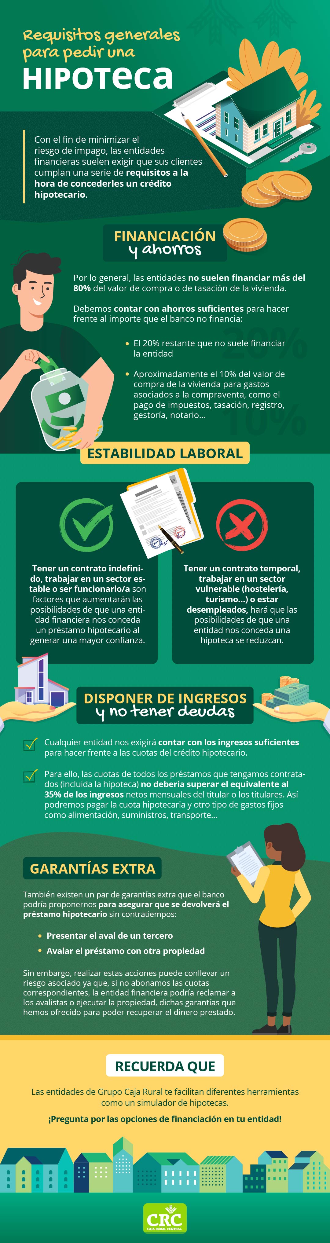 La adquisición de una vivienda es, para muchos, un momento decisivo en sus vidas, un gran paso logrado con esfuerzo y trabajo. Pero no todas las personas cuentan con los ahorros suficientes para abonar al contado esta compra, por eso se recurre a los créditos hipotecarios. Sin embargo, ¿cuáles son los requisitos generales que se deben cumplir para obtener una hipoteca? Te lo explicamos a continuación. Contratar una hipoteca: ¿cuáles son los principales requisitos? Pese a que cada una de las entidades financieras pueden variar sus condiciones o añadir otras adicionales, lo más habitual es que se requieran estos requisitos generales: Contrato laboral Uno de los aspectos a tener en cuenta es la estabilidad laboral y la seguridad de que puedas afrontar el pago de las cuotas mensuales correspondientes. De hecho, tener un contrato de trabajo indefinido, disponer de un empleo en un sector laboral estable o, directamente, trabajar en el sector público pueden ayudar a aumentar las probabilidades de conseguir una hipoteca. Ahorros Generalmente, las entidades financieras financian un 80% del valor total de la tasación o adquisición de la vivienda. Es decir, en el momento de solicitar una hipoteca, debemos contar con los suficientes ahorros para abonar la parte no financiada. Por esto mismo, es recurrente que uno de los requisitos sea tener el 30% del valor total de compra: el 20% destinado a sufragar la parte que no financia la entidad y el 10% restante para abonar gastos extra. Garantías adicionales Otras de las condiciones que suelen requerir habitualmente las entidades financieras son algunas garantías como, por ejemplo, la presentación de un aval por parte de una tercera persona o la opción de avalar el crédito hipotecario con otra propiedad, aunque tenga un riesgo asociado. Estabilidad financiera A la hora de conceder una hipoteca, las entidades financieras valoran que la persona solicitante de esta financiación no tenga deudas con ninguna otra entidad. Para ello, se aseguran de que el futuro propietario tenga ingresos suficientes y recurrentes para hacer frente al pago de las cuotas. No obstante, no se recomienda que la cuantía de los préstamos que se han contratado sea superior al 35% de los ingresos netos mensuales del titular. De este modo, se puede desembolsar la letra de la hipoteca sin tener que sufragar otros gastos fijos (alimentación, suministros energéticos o transporte) ¿Cómo puedo calcular la cuota hipotecaria? Normalmente, las entidades financieras asesoran a sus clientes sobre las opciones de financiación que más se adecúan a sus necesidades económicas y les ayudan a establecer objetivos a largo plazo. En Caja Rural Central, queremos apoyarte en todas tus decisiones, y a su vez, aportarte servicios que puedan facilitar tu vida, como es el caso de nuestro simulador de hipotecas, con el que podrás consultar rápidamente las cuotas mensuales que tendrías que desembolsar en función del plazo establecido y los costes adicionales. Una gran opción para saber aproximadamente cuál es el crédito hipotecario perfecto para ti.