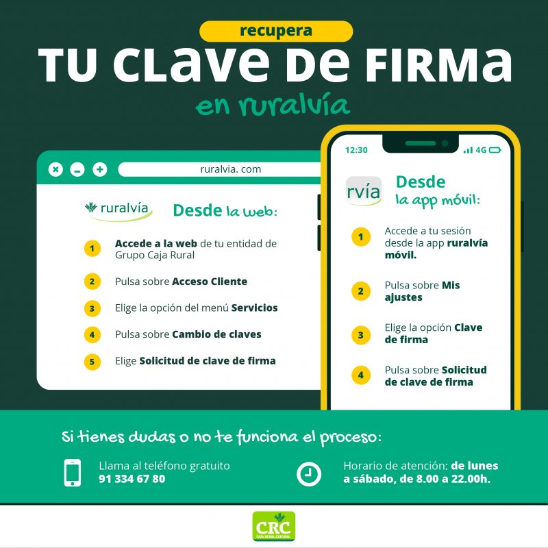 En el momento de realizar operaciones o contratar productos y servicios en nuestra banca digital necesitamos una clave de firma que avale nuestra identidad. En el caso de que la hayamos perdido no hay por qué preocuparse, porque ruralvía nos ofrece una solución rápida y cómoda para recuperarla en cuestión de minutos. La primera vez que entres en ruralvía tendrás que modificar tu clave de firma, personalizándola para que no se te olvide. Además, tendrás que ofrecer tu número de teléfono para que puedas confirmar algunas transacciones concretas con el método de doble autenticación y un SMS que te llegará al móvil. La clave de firma te permite garantizar la validez de tus operaciones con Caja Rural Central, así que vamos a contarte cómo puedes hacerte con una nueva si ya no cuentas con ella, sea cual sea el motivo. ¡Atento a la infografía!