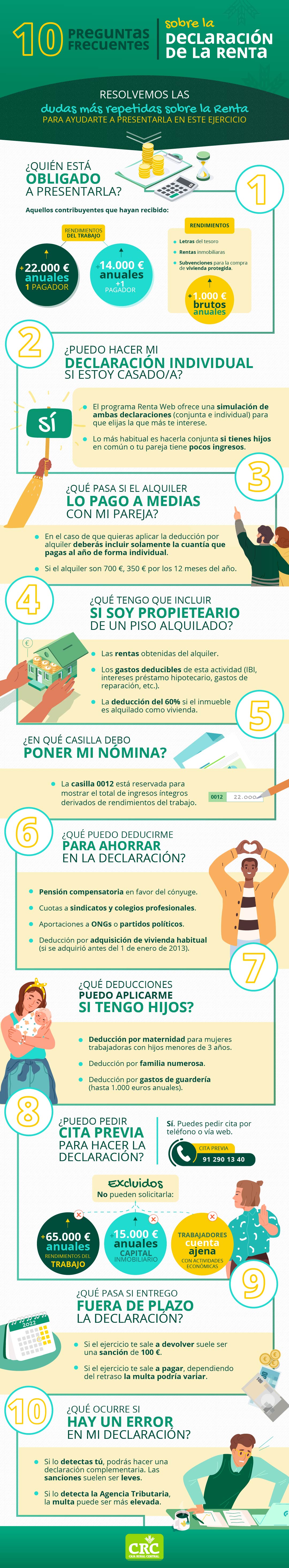 La declaración de la Renta en 10 preguntas frecuentesEste año 2022, la fecha límite para gestionar este trámite es el 30 de junio y como contribuyente, es normal que te surjan dudas: ¡Te ayudamos! Una vez entrada la primavera, da comienzo la cuenta atrás para hacer la Declaración de la Renta. Este año, la fecha límite para gestionar este trámite es el 30 de junio y como contribuyente, es normal que tengas dudas. En especial, aquellas personas que se enfrentan a su primera declaración temen cometer un error y recibir el toque (que equivale a sanción) por parte de la Agencia Tributaria. Pero no son los únicos, pues cuantas más propiedades, inversiones y ganancias se tengan más casillas se han de rellenar, aumentando la probabilidad de cometer un despiste. Desde Caja Rural Central queremos facilitarte todas las gestiones, incluido el pago de impuestos. Además, te mantendremos siempre informado en nuestro blog, en esta ocasión con una infografía para que resuelvas tus dudas respecto a la declaración. Antes de presentar el ejercicio del 2021, repasa todos los puntos que te mostramos. Cuestiones como la obligatoriedad de la declaración en dependencia de los ingresos o el número de pagadores, las deducciones típicas, las declaraciones conjuntas con un cónyuge… Una vez entrada la primavera, da comienzo la cuenta atrás para hacer la Declaración de la Renta. Este año, la fecha límite para gestionar este trámite es el 30 de junio y como contribuyente, es normal que tengas dudas. En especial, aquellas personas que se enfrentan a su primera declaración temen cometer un error y recibir el toque (que equivale a sanción) por parte de la Agencia Tributaria. Pero no son los únicos, pues cuantas más propiedades, inversiones y ganancias se tengan más casillas se han de rellenar, aumentando la probabilidad de cometer un despiste. Desde Caja Rural Central queremos facilitarte todas las gestiones, incluido el pago de impuestos. Además, te mantendremos siempre informado en nuestro blog, en esta ocasión con una infografía para que resuelvas tus dudas respecto a la declaración. Antes de presentar el ejercicio del 2021, repasa todos los puntos que te mostramos. Cuestiones como la obligatoriedad de la declaración en dependencia de los ingresos o el número de pagadores, las deducciones típicas, las declaraciones conjuntas con un cónyuge… Una vez solventadas tus dudas, podrás preparar un borrador online para tramitar la declaración online o pedir cita en Hacienda para que te ayuden en aquellos apartados que resulten demasiado complejos. Si no las tienes todas contigo, contar con un gestor de confianza puede ser la mejor opción. Los profesionales por cuenta ajena suelen delegar el ejercicio impositivo en un gestor, al menos en la primera ocasión. Una vez solventadas tus dudas, podrás preparar un borrador online para tramitar la declaración online o pedir cita en Hacienda para que te ayuden en aquellos apartados que resulten demasiado complejos. Si no las tienes todas contigo, contar con un gestor de confianza puede ser la mejor opción. Los profesionales por cuenta ajena suelen delegar el ejercicio impositivo en un gestor, al menos en la primera ocasión.