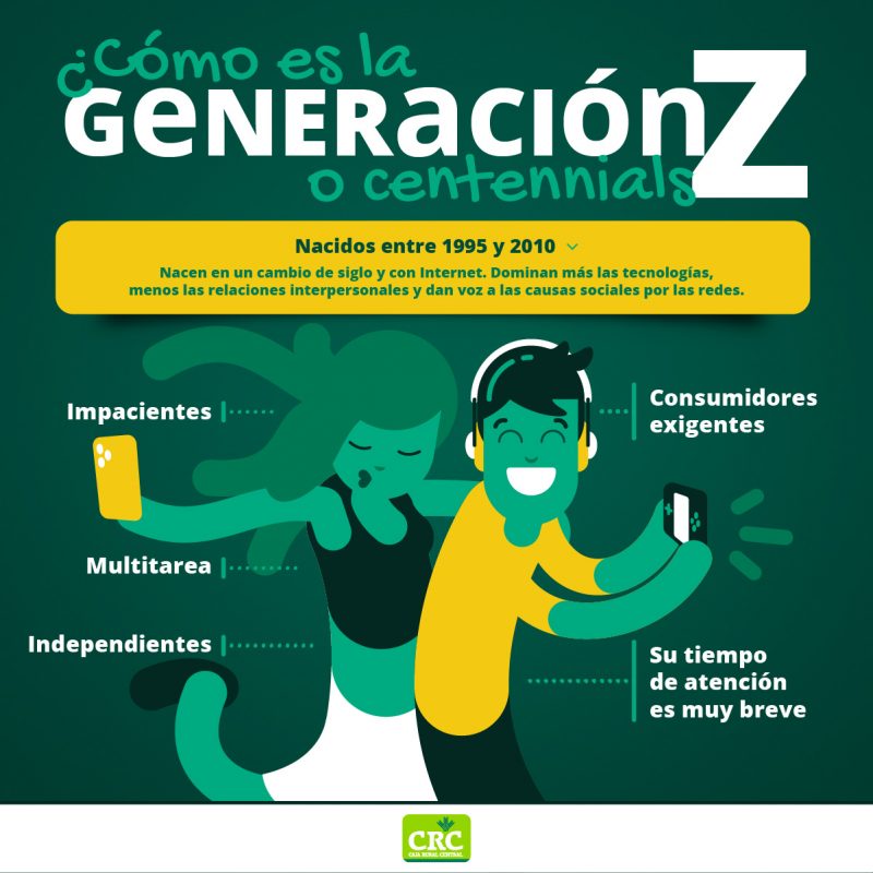 La Generación Z o centennials: irreverentes y digitalesLa generación Z o nativa digital es irreverente, y le encanta disfrutar del tiempo libre. Descubre cómo se comportan los jóvenes de la generación más individualista y ahorradora. A la hora de tratar con los jóvenes centennials de la generación Z, debemos tener en cuenta cómo se comportan. Los chicos y chicas nacidos entre 1995 y 2010 son nativos digitales, y con la transición del cambio de siglo buscan estabilidad financiera para protegerse de la crisis que llegó a la generación previa de los millennials. La generación Z está caracterizada por la irreverencia en todos los aspectos de su vida. Internet les ha dado una vía para expresarse, al igual que la generación X, y no se conforman fácilmente con la información que reciben. Además, su tiempo de atención es corto y necesitan estímulos constantes para sentirse motivados. ¿Quieres saber cómo son los jóvenes de la generación Z? En esta gráfica hemos preparado una serie de características para que sepas cómo se comportan y cómo entenderlos en profundidad. A la hora de tratar con los jóvenes centennials de la generación Z, debemos tener en cuenta cómo se comportan. Los chicos y chicas nacidos entre 1995 y 2010 son nativos digitales, y con la transición del cambio de siglo buscan estabilidad financiera para protegerse de la crisis que llegó a la generación previa de los millennials. La generación Z está caracterizada por la irreverencia en todos los aspectos de su vida. Internet les ha dado una vía para expresarse, al igual que la generación X, y no se conforman fácilmente con la información que reciben. Además, su tiempo de atención es corto y necesitan estímulos constantes para sentirse motivados. ¿Quieres saber cómo son los jóvenes de la generación Z? En esta gráfica hemos preparado una serie de características para que sepas cómo se comportan y cómo entenderlos en profundidad. La wifi y las redes sociales, como Instagram o Youtube, son el pan de cada día para la generación Z, que en su ambición por comunicarse con el mundo pueden aspirar a empleos relacionados con la publicidad en línea, el periodismo o el community management.