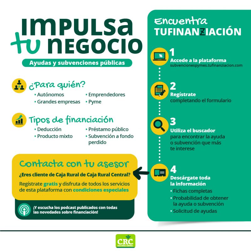 La plataforma ideal para encontrar financiación pública para tu proyectoTe enseñamos Tufinanziazion, una plataforma ideal para que encuentres toda la información que necesitas sobre financiación pública para tu proyecto. Cuando buscamos liquidez para un negocio se revisan las posibilidades de financiación pública en todas las webs que existen, pero a veces es más complicado de lo que se pensaba. Además, cuando encuentras una ayuda o subvención que te puede interesar, te das cuenta de que la convocatoria ni siquiera está en su fecha. Con la plataforma Tufinanziazion, los clientes de Caja Rural Central pueden ahorrarse muchas horas de búsqueda y localizar opciones de financiación pública en cuestión de minutos. Esta plataforma digital ofrece a empresas pequeñas y grandes, emprendedores o autónomos cientos de subvenciones públicas que pueden ver según el criterio que más les interese: localización, local e incluso europea, o sector de actividad. Es, junto con las líneas ICO, una de las mayores fuentes de ayudas públicas en internet. Aquí puedes descubrir qué tipos de financiación y ayudas públicas ofrece la plataforma, junto con los plazos de vencimiento y enlaces para que puedas inscribirte desde la convocatoria inicial. Cuando buscamos liquidez para un negocio se revisan las posibilidades de financiación pública en todas las webs que existen, pero a veces es más complicado de lo que se pensaba. Además, cuando encuentras una ayuda o subvención que te puede interesar, te das cuenta de que la convocatoria ni siquiera está en su fecha. Con la plataforma Tufinanziazion, los clientes de Caja Rural Central pueden ahorrarse muchas horas de búsqueda y localizar opciones de financiación pública en cuestión de minutos. Esta plataforma digital ofrece a empresas pequeñas y grandes, emprendedores o autónomos cientos de subvenciones públicas que pueden ver según el criterio que más les interese: localización, local e incluso europea, o sector de actividad. Es, junto con las líneas ICO, una de las mayores fuentes de ayudas públicas en internet. Aquí puedes descubrir qué tipos de financiación y ayudas públicas ofrece la plataforma, junto con los plazos de vencimiento y enlaces para que puedas inscribirte desde la convocatoria inicial.