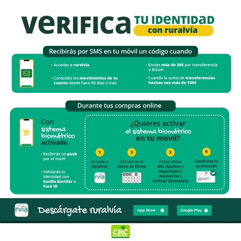 Ruralvía es el servicio de banca digital que utilizan los clientes de Caja Rural Central. Entre los beneficios que más valoran los clientes encontramos la seguridad, la comodidad, la facilidad de uso y la rapidez. Pero solo uno de ellos les permite sentirse tranquilos cada vez que utilizan Ruralvía, y es que las medidas de seguridad que aplicamos en Ruralvía hace que los clientes se sientan protegidos. Ruralvía cuenta con mecanismos de doble autenticación diseñados para que los clientes de CRC verifiquen su identidad en ciertos momentos, y así sea más complicado que sean víctimas de algún ciberdelito, de un fraude o de una suplantación de identidad. Por ejemplo, los clientes de Caja Rural Central tendrán que verificar su identidad cuando vayan a acceder a ruralvía cada 90 días, o cuando vayan a enviar dinero siempre que sea superior a 30 euros. También, para mejorar la experiencia de nuestros clientes, cuando se vaya a completar una compra a través de un comercio electrónico, si el cliente de CRC ha activado el sistema biométrico en su teléfono móvil, podrá confirmar la operación a través del Face ID o de la huella dactilar.