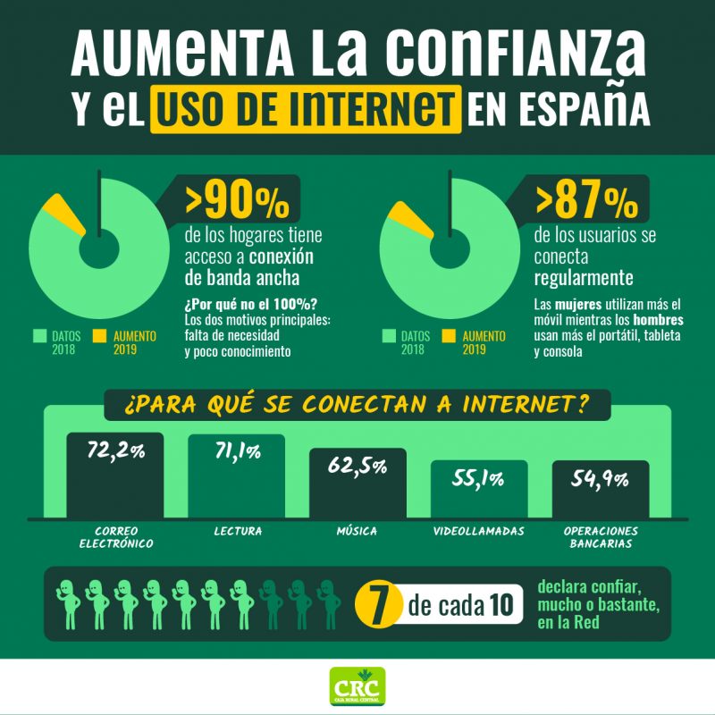 Los españoles tenemos patrones de consumo muy parecidos respecto a internet. Muchos de nosotros lo utilizamos en distintos dispositivos, en distintos lugares de nuestra ciudad y sin apenas diferencias entre sexos. Así lo establece el Observatorio Español de la Economía y la Sociedad Digital, ONTSI, el cual identifica que los hogares con acceso a internet en España superan ya el 90 por ciento. Esto supone un crecimiento del 5,1 por ciento respecto a 2018. La banda ancha se encuentra presente en casi todos esos hogares. La fibra óptica o red de cable de distintas operadoras, el ADSL, la telefonía móvil 3G O 4G nos permiten una facilidad de interconexión como nunca antes habíamos visto. Pero también hay viviendas que no disponen de ninguna conexión a internet, bien sea por la falta de necesidad (75,5%), la falta de conocimientos para usarlo (51,3%) y por los altos costes del equipo (28%). El 78,2% de las mujeres y el 77,0% de los hombres utilizan internet a diario. Las mujeres prefieren hacerlo a través del teléfono móvil, mientras que los hombres se encargan de comunicarse con el portátil, la tableta y la consola. El año pasado ha sido el primero sin desigualdad en su uso entre hombres y mujeres.