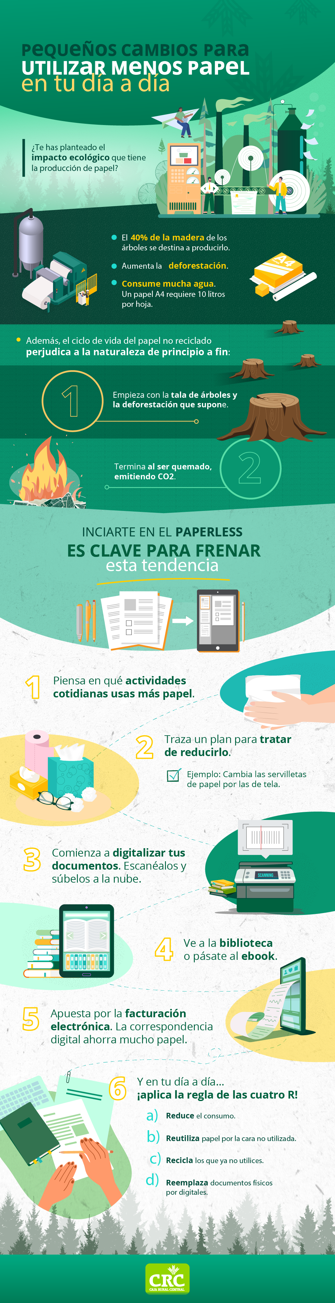 No existe una solución perfecta, pues es probable que sigas necesitando un libro para estudiar y se podría argumentar que su versión digital consume energía. La tendencia paperless aboga por un uso moderado y consciente del papel, de modo que logremos reducir su consumo. En la infografía te proponemos 6 acciones sencillas para aplicar en tu día a día. Mientras tanto, en Caja Rural Central estamos apostando por la reducción de papel con servicios como Infomail, para recibir la correspondencia de tu entidad financiera por correo electrónico. Otra posibilidad que tienen los clientes de CRC es elegir el Buzón Virtual para recibir todas las comunicaciones de Caja Rural Central, donde sabe que tendrá toda tu correspondencia archivada durante 5 años.