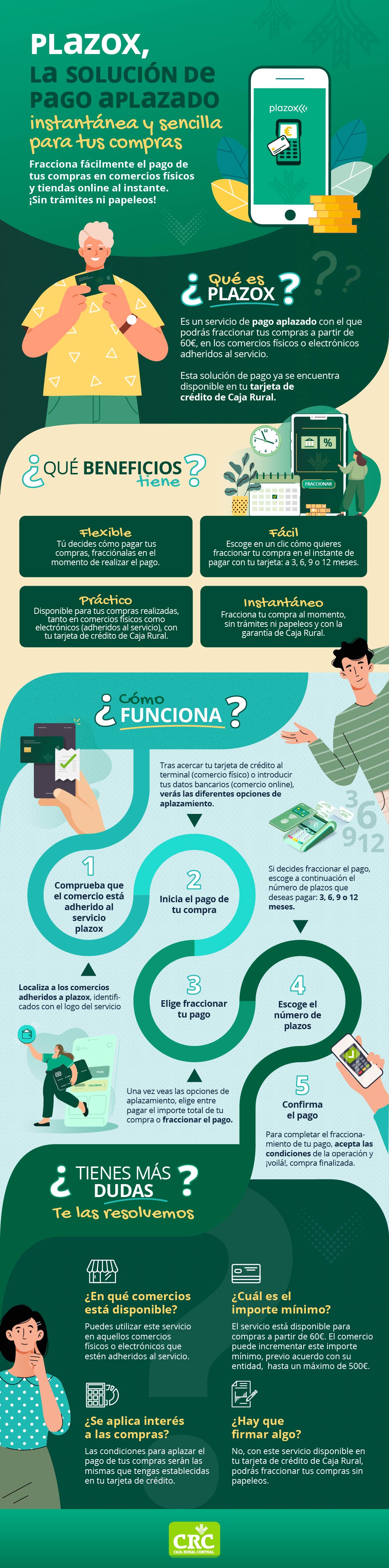 Los métodos de pago flexibles o pagos a plazos se han convertido en uno de los factores más recurrentes por los consumidores actuales. Hoy te contamos en qué consiste este nuevo sistema de pago fraccionado instantáneo llamado plazox. ¿Para qué sirve plazox? Este servicio permite a los usuarios decidir, en el mismo momento de la compra, si quieren realizar el pago en distintos plazos. Esta opción está activada de forma automática en las tarjetas de crédito de todos los clientes de Caja Rural Central. De hecho, tienes la posibilidad de elegir esta alternativa tanto en los comercios físicos como en los comercios electrónicos. ¿Cuáles son las ventajas? Estas son algunas de las ventajas más destacadas de este nuevo sistema de pago aplazado:- Flexible: tú eres quien elige los plazos para realizar el pago de tus compras, puedes fraccionarlo en 3, 6, 9 o 12 meses.