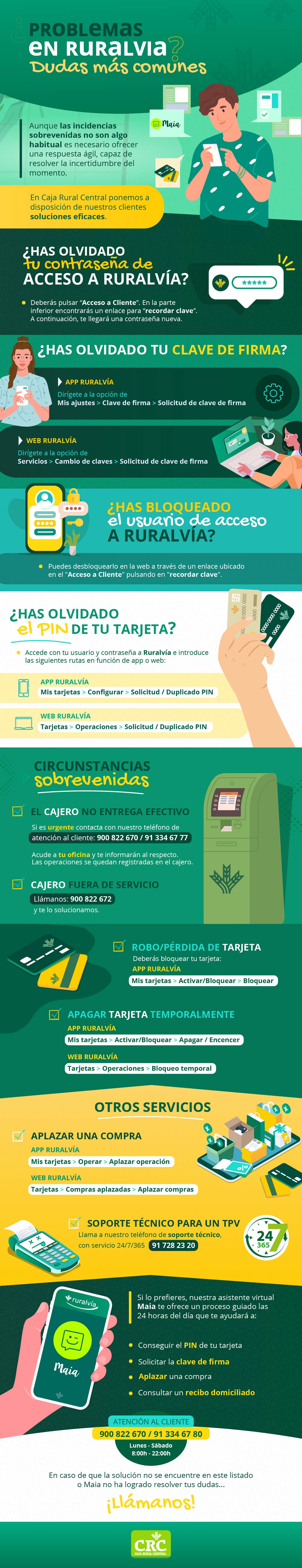 ¿Qué hacer cuando algo falla en Ruralvía? Resolvemos tus dudasCasi todos los inconvenientes tienen una rápida solución a través de la banca digital, aunque este no es el único modo. Recuerda que en Caja Rural Central apostamos por mantener las buenas costumbres, por lo que encontrarás asistencia en oficinas y a través de nuestros números de atención al cliente. Algunos imprevistos en nuestro día a día pueden provocarnos malestar e incertidumbre: ¿Qué pasa si, al solicitar la retirada de efectivo en el cajero, éste falla y no te entrega nada? ¿Y si te olvidas de tu PIN justo cuando querías realizar una compra? Peor aún, ¿Cómo reaccionar si has despistado tu tarjeta de crédito o débito? Estos temores son habituales, por lo que desde Caja Rural Central hemos querido darles respuesta. En esta infografía te explicamos qué hacer ante una circunstancia sobrevenida. Imprevistos más frecuentes y cómo solucionarlos lo más rápido posible. Casi todos los inconvenientes tienen una rápida solución a través de la banca digital, aunque este no es el único modo. Recuerda que en Caja Rural Central apostamos por mantener las buenas costumbres, por lo que encontrarás asistencia en oficinas y a través de nuestros números de atención al cliente. En todo caso, no dudes en guardarte esta información para mantener la calma en situaciones como: Algunos imprevistos en nuestro día a día pueden provocarnos malestar e incertidumbre: ¿Qué pasa si, al solicitar la retirada de efectivo en el cajero, éste falla y no te entrega nada? ¿Y si te olvidas de tu PIN justo cuando querías realizar una compra? Peor aún, ¿Cómo reaccionar si has despistado tu tarjeta de crédito o débito? Estos temores son habituales, por lo que desde Caja Rural Central hemos querido darles respuesta. En esta infografía te explicamos qué hacer ante una circunstancia sobrevenida. Imprevistos más frecuentes y cómo solucionarlos lo más rápido posible. Casi todos los inconvenientes tienen una rápida solución a través de la banca digital, aunque este no es el único modo. Recuerda que en Caja Rural Central apostamos por mantener las buenas costumbres, por lo que encontrarás asistencia en oficinas y a través de nuestros números de atención al cliente. En todo caso, no dudes en guardarte esta información para mantener la calma en situaciones como:- Has olvidado la contraseña de acceso a Ruralvía