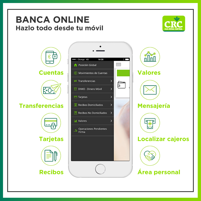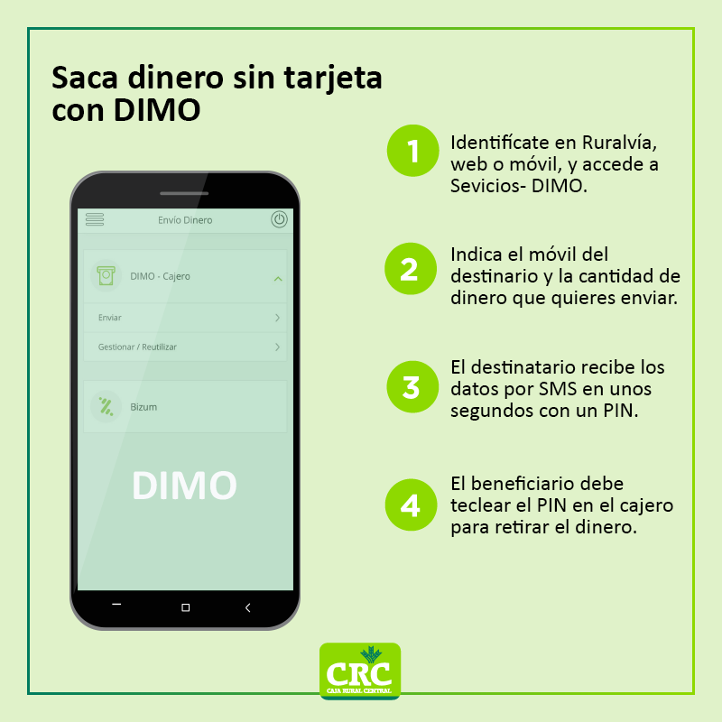 Con este servicio de CRC puede enviar dinero a un familiar, por ejemplo, para que lo recoja al instante en cualquier cajero CRC y de la red de cajeros del grupo Caja Rural . Es muy sencillo, sin tarjeta, sin complicaciones, para enviar dinero a alguien solo es necesario conocer su número de móvil. Tan solo tiene que seguir estos sencillos pasos.