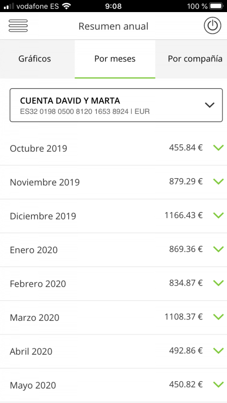 Resumen Anual es una herramienta diseñada para analizar los ingresos y gastos de tus facturas, de forma que puedas mejorar tu salud financiera casi sin darte cuenta. A través de ella puedes consultar el resumen de tus recibos en los últimos 21 meses. Las tres características que incluye te permite ver un gráfico anual para consultar la evolución de tus recibos mes a mes y dos desgloses: uno para los recibos agrupados de forma mensual y otro organizado según el emisor del propio recibo.