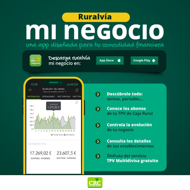 Ruralvía mi negocio, una app móvil para controlar las ventas de tu empresaLa era de la digitalización llega a tu empresa con Ruralvía mi negocio, una app de Caja Rural Central diseñada para que puedas organizar y planificar tus actividades. Descubre todas sus ventajas y beneficios Un autónomo o un empresario saben que las claves para ver crecer su negocio son la perseverancia y la planificación. Por ello no deben perder nunca de vista cuáles son los gastos e ingresos de su actividad, mientras que deben asegurarse un conocimiento profundo de la relación con sus proveedores y estar al día sobre si el servicio que están dando a sus clientes es el esperado. Hoy en día, cuentan con una app que puede ayudarles en ello, ruralvía mi negocio, y para trabajar con ella tan solo tienen que descargarla de manera gratuita en Google Play o en la App Store. Ruralvía mi negocio está diseñada para ti, porque en Caja Rural Central sabemos que necesitas tener a mano toda la información de tu empresa para tomar decisiones que beneficien tus ventas. Una compañía que tendrás siempre a mano para poder fijar objetivos en la estrategia de digitalización a largo plazo y llevar al día un resumen completo de tu negocio, de las liquidaciones de abonos o el detalle de cobro de los TPVs de tu establecimiento. Suena bien, ¿verdad? Pues presta atención a esta gráfica en la que puedes ver las ventajas que tienes con Ruralvía mi negocio. Tan solo necesitas ser cliente usuario de ruralvía y contar con un TPV de Caja Rural Central, por lo que el procedimiento es muy sencillo. Un autónomo o un empresario saben que las claves para ver crecer su negocio son la perseverancia y la planificación. Por ello no deben perder nunca de vista cuáles son los gastos e ingresos de su actividad, mientras que deben asegurarse un conocimiento profundo de la relación con sus proveedores y estar al día sobre si el servicio que están dando a sus clientes es el esperado. Hoy en día, cuentan con una app que puede ayudarles en ello, ruralvía mi negocio, y para trabajar con ella tan solo tienen que descargarla de manera gratuita en Google Play o en la App Store. Ruralvía mi negocio está diseñada para ti, porque en Caja Rural Central sabemos que necesitas tener a mano toda la información de tu empresa para tomar decisiones que beneficien tus ventas. Una compañía que tendrás siempre a mano para poder fijar objetivos en la estrategia de digitalización a largo plazo y llevar al día un resumen completo de tu negocio, de las liquidaciones de abonos o el detalle de cobro de los TPVs de tu establecimiento. Suena bien, ¿verdad? Pues presta atención a esta gráfica en la que puedes ver las ventajas que tienes con Ruralvía mi negocio. Tan solo necesitas ser cliente usuario de ruralvía y contar con un TPV de Caja Rural Central, por lo que el procedimiento es muy sencillo. Consulta las operaciones realizadas en tu comercial en tiempo real, analiza la evolución de ventas por fechas, o prepara el plan de exportaciones de tu empresa de manera rápida y eficaz. Desde el primer momento, todo son facilidades con esta app intuitiva y sencilla, diseñada para que tu negocio llegue a lo más alto. Consulta las operaciones realizadas en tu comercial en tiempo real, analiza la evolución de ventas por fechas, o prepara el plan de exportaciones de tu empresa de manera rápida y eficaz. Desde el primer momento, todo son facilidades con esta app intuitiva y sencilla, diseñada para que tu negocio llegue a lo más alto.