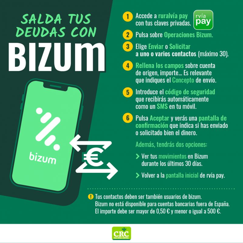 Utiliza Bizum para saldar deudas, ¡te explicamos cómo!Bizum es mucho más que una app de pago entre amigos. Aprende a utilizar Bizum y salda deudas e incluso paga en tiendas online de forma fácil, cómoda, rápida y segura ¿Cuántas veces has sido tú quien ha pagado un regalo que hacéis entre todos los amigos, la cena que pedisteis o la reserva de una pista para el partido? Y, ¿cuánto tiempo has tardado en recuperar todo el dinero? Olvídate de que esto te vuelva a pasar. Con Bizum, en solo 5 segundos, el dinero llega a la cuenta de quien tú quieras de forma inmediata y segura. ¡Te contamos cómo utilizar Bizum! Lo primero que tienes que hacer es descargarte la app ruralvía Pay, la aplicación de pago móvil para los clientes de Caja Rural Central. Con ella, a través de Bizum, podrás pedir o enviar dinero a tus amigos, siempre y cuando tengas su número de móvil y ambos lo tengáis habilitado. Aprende cómo en la siguiente infografía: ¿Cuántas veces has sido tú quien ha pagado un regalo que hacéis entre todos los amigos, la cena que pedisteis o la reserva de una pista para el partido? Y, ¿cuánto tiempo has tardado en recuperar todo el dinero? Olvídate de que esto te vuelva a pasar. Con Bizum, en solo 5 segundos, el dinero llega a la cuenta de quien tú quieras de forma inmediata y segura. ¡Te contamos cómo utilizar Bizum! Lo primero que tienes que hacer es descargarte la app ruralvía Pay, la aplicación de pago móvil para los clientes de Caja Rural Central. Con ella, a través de Bizum, podrás pedir o enviar dinero a tus amigos, siempre y cuando tengas su número de móvil y ambos lo tengáis habilitado. Aprende cómo en la siguiente infografía:  Paga tus compras online con BizumBizum ya no es sólo la app para el pago entre amigos. Además, permite el pago de compras online. Para pagar con Bizum las compras que realices en internet, sólo necesitas tu número de teléfono y la clave Bizum. Obtener tu clave Bizum para realizar tus compras online es muy sencillo: entra ruralvía pay y accede a ajustes > ajustes bizum > clave bizum. Además, si en algún momento necesitas modificar o recuperar tu clave, podrás realizar la gestión siguiendo esta misma ruta. Como ves, los clientes de Caja Rural Central tienen la posibilidad de beneficiarse de Bizum a través de ruralvía pay, y disfrutar de un servicio fácil, rápido, cómodo y seguro.